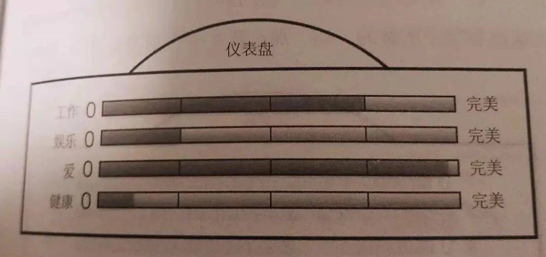 《人生设计课》提出了一个可以评估当前状况的方法,叫做 “健康/工作/娱乐/爱”仪表盘 ,可以先从健康、工作、娱乐和爱这四方面来评估一下自己的现状。